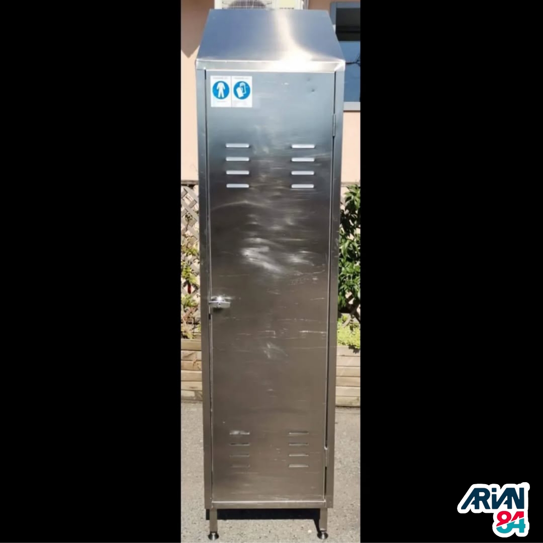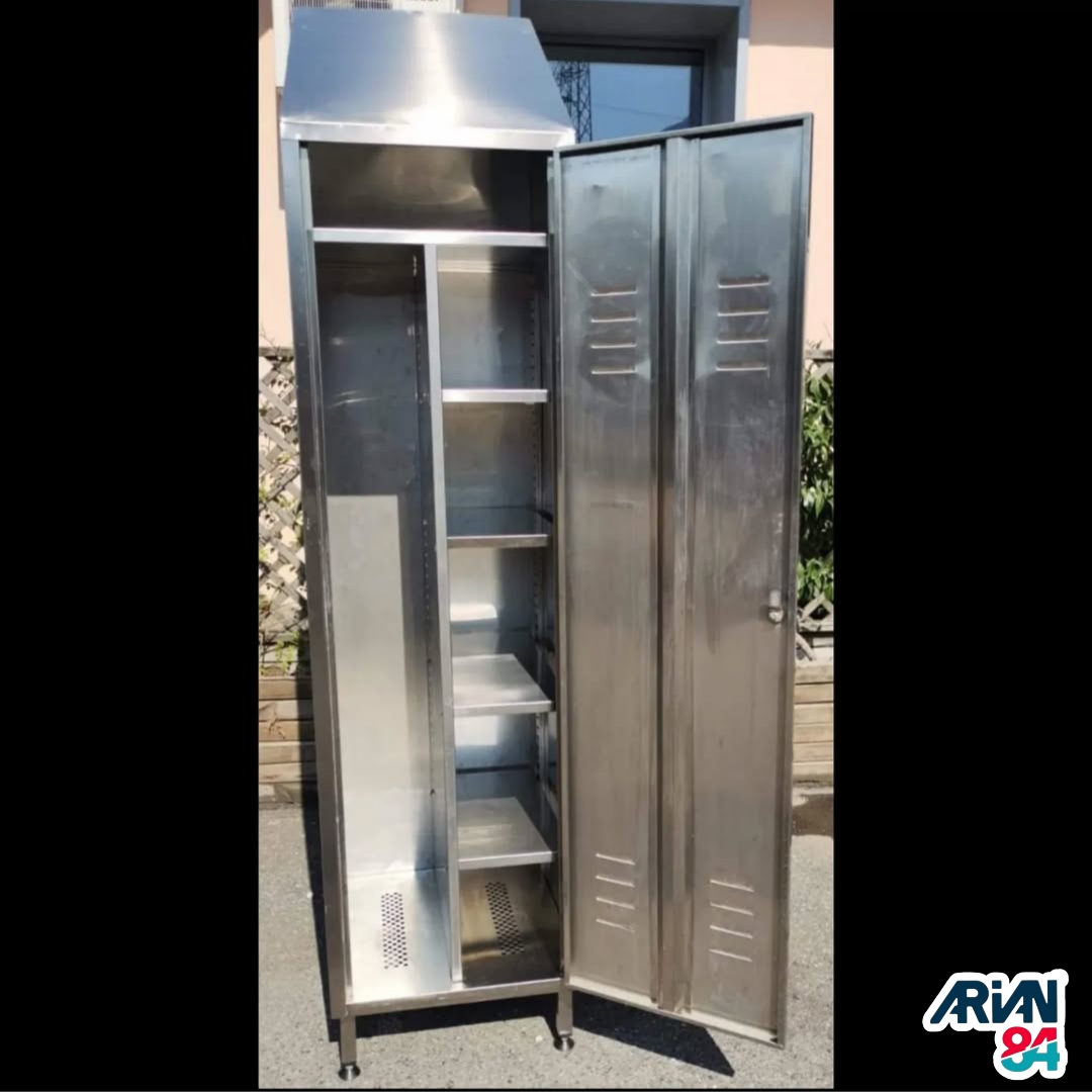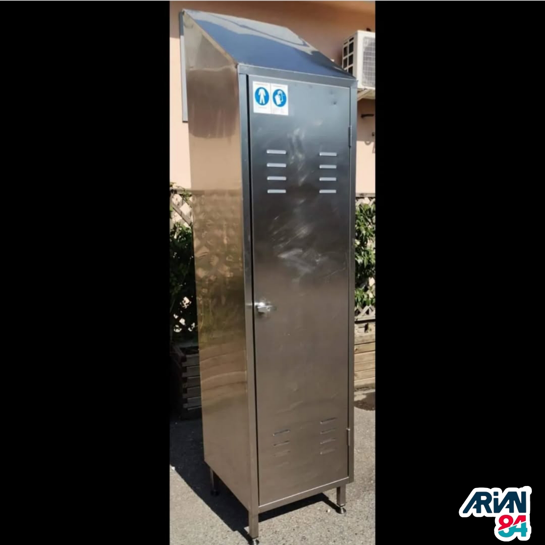 Armadietto spogliatoio in acciaio inox usato, con vano scarpe, pulito e sporco , il vano a destra ha 4 ripiani regolabili in altezza, estremità superiore inclinata, misure larghezza cm 50,5, profondità cm 50, altezza tot cm 216, € 220 (oltre iva su fattura)